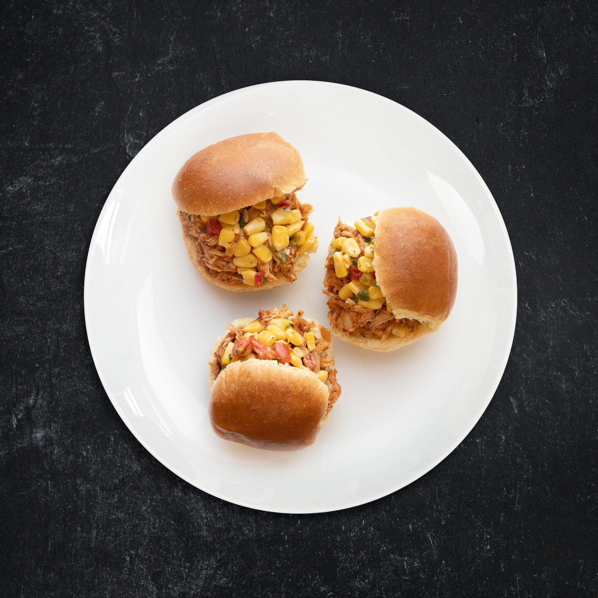 Ingredients: Antibiotic & Hormone-Free Chicken Breast, Brioche Slider Buns (Wheat)(Enriched Wheat Flour, Water, Eggs, Butter, Sugar, Yeast, Salt, Milk, Whey, Natural Flavors, Monoglycerides, Ascorbic Acid, Enzymes, Calcium Propionate), Carrots, Mexican Street Corn (corn, jalapeno, olive oil mayo, cilantro, lime juice, scallions, paprika, cumin, cayenne), Pepper Jack Cheese (Milk), Honey-Chipotle Sauce (Wild Flower Honey, Chipotle Peppers in Adobo, Olive Oil, Lime Juice, White Vinegar, Smoked Paprika), Tajin Spice, Sea salt