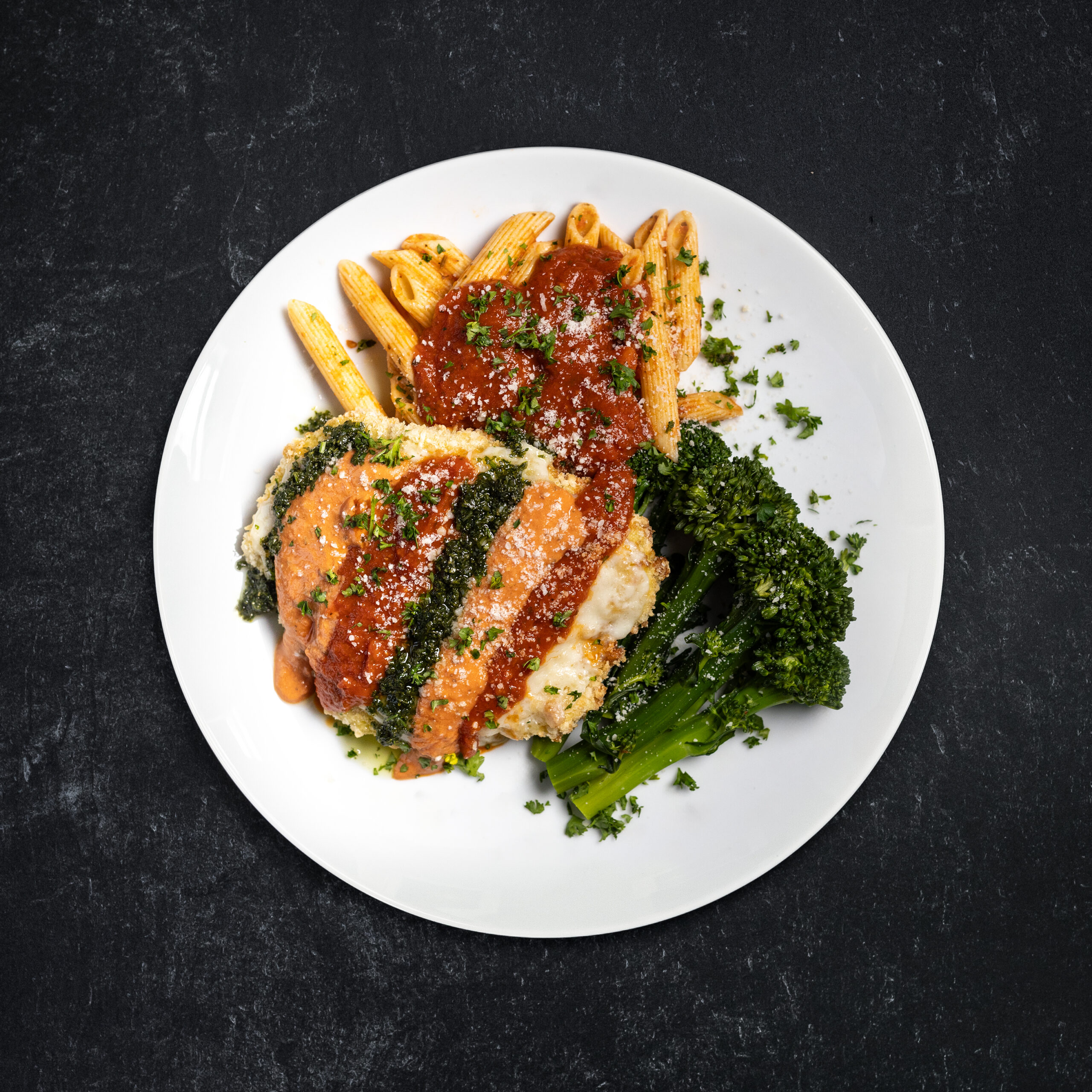Breaded free-range chicken topped with melted mozzarella, finished with a trio of sauces—marinara, vodka, and basil pesto—served with protein pasta and broccolini.